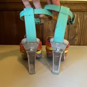 Vibrant heels with multicolor straps. Features a clear block heel. Perfect for a bold look.