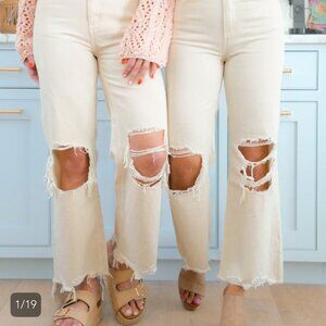 Stylish cream cropped jeans with bold ripped accents. Perfect for casual outings.