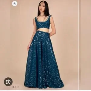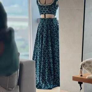 Dazzle in this elegant teal Lehenga adorned with shimmering mirror work. The skirt is size small and the blouse is an XS. This gorgeous set is sold out from the saree room so you may not find it elsewhere. Perfect for weddings or any festive occasion! Teal Dupatta can be included, but why would you cover such a stunning set?