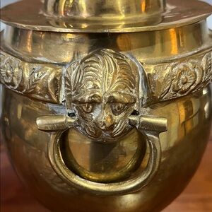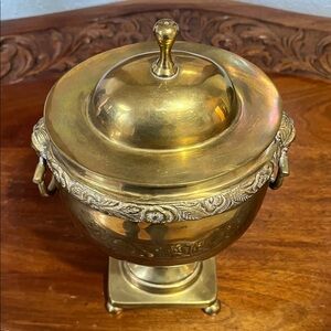 Beautiful brass urn with intricate detailing and a lid. Perfect for home decor.