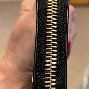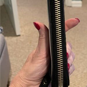 Stylish MK wristlet with bold black and white stripes. Wrap around zipper. Gold-tone zipper and logo accent.