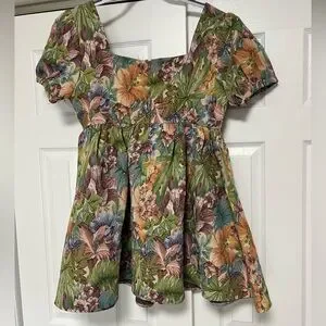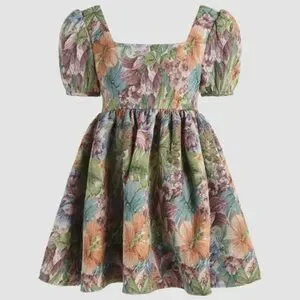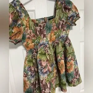 Vibrant floral dress with puff sleeves. Perfect for vacations