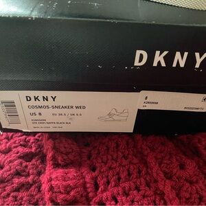 Sleek DKNY sneakers with bold logo strap. Comfortable slip-on style. Perfect for everyday wear. Fabric and suede around the foot edges.