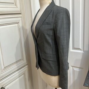 Beautiful condition, like new. Pockets still sewn shut. Size 2, displayed on my size 4 mannequin for reference. Theory Gabe B Sege blazer, 99% lightweight and soft virgin wool. gray but not solid.. it looks almost like a micro checked print. Photo taken up close. Stock photos may not be exact and used for style and fit.