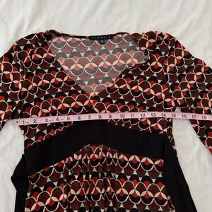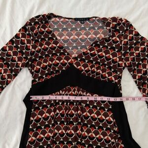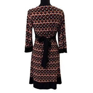 Keywords: Tiana B, geometric print dress, retro dress, 3/4 sleeve dress, knee length dress, womens dress, small dress, boho dress, casual dress, work dress, vintage inspired, A-line dress, tie waist dress, bohemian dress, mod dress