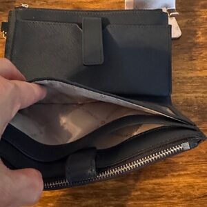 Interior features two zip compartments, an open Compartment, phone pocket, two slit pockets, six card slots, Elegant blue wristlet