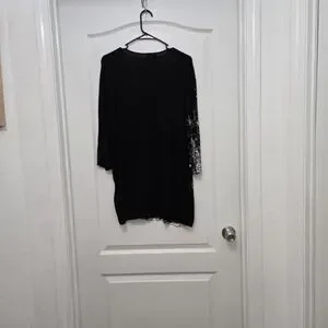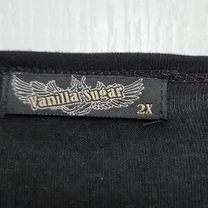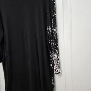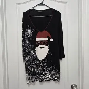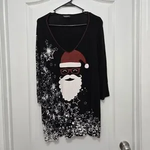 T9251004 Festive long sleeve tee with Santa design. Black base with red and white accents. Size 2X V-neck. 96% Rayon 4% Spandex. Perfect for holiday cheer. Good condition like new.