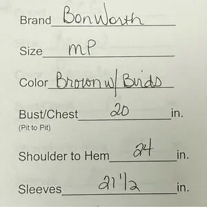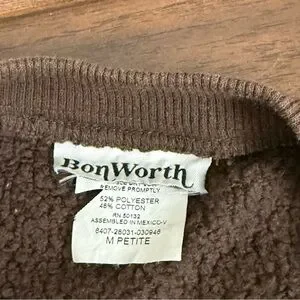 Charming BonWorth brown cardigan in Petite Medium with beautiful embroidered bird and floral designs on the front. Features a cozy knit blend (52% polyester, 48% cotton), button-up closure, and soft texture. Perfect for layering during fall and winter, or as a lightweight spring cardigan with a nature-inspired touch. Adds a whimsical cottagecore and vintage feel to your wardrobe.