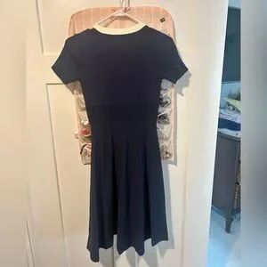 Elegant navy dress featuring cream bow accents and a tie neckline. Perfect for any occasion.