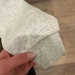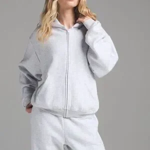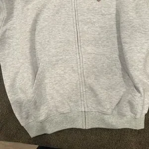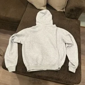 Cozy light gray hoodie. Features front pockets. Full zip closure.