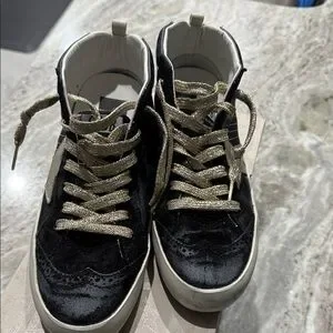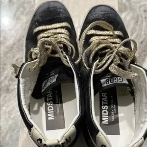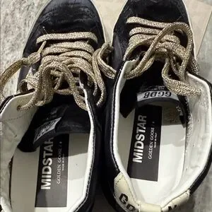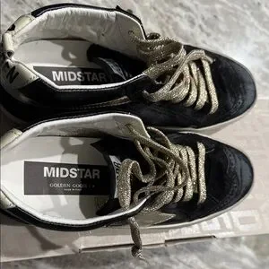 Chic Golden Goose Midstar sneakers. Features glittery gold laces and sleek black design. Ideal for a fashionable statement.