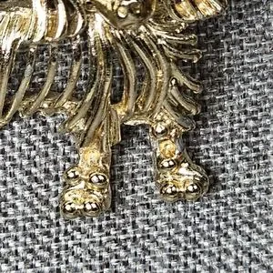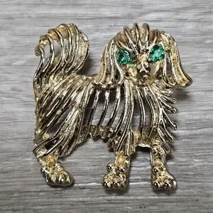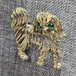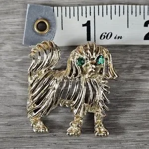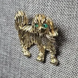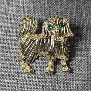 Dog brooch. Gold tone with green eyes. In good pre-owned condition, but does have slight discoloration on the front and a bit more discoloration on the back, please see the photos. Approx 1.25"