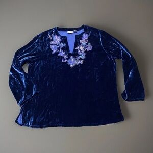 Vtg Chicos Velvet Top Women 3/XL Boho Royal Blue Embroidered Whimsigoth Grunge Artsy Floral Vacation party
