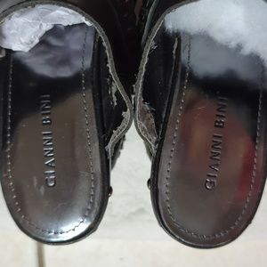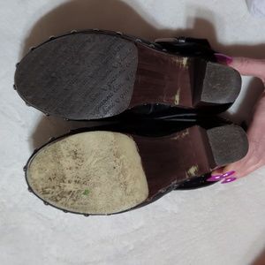 Gianni Bini genuine leather clogs. Size 9. Black leather upper with faux wood block heels. Detailed with a braided leather and chain strap and silver rivets/studs. These are slip on, mule style with a 4" heel and 1" platform for a total height of 5".