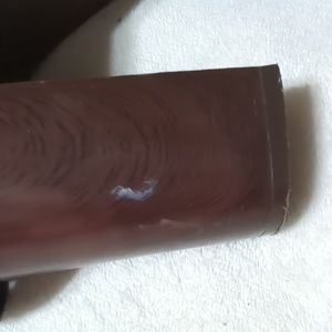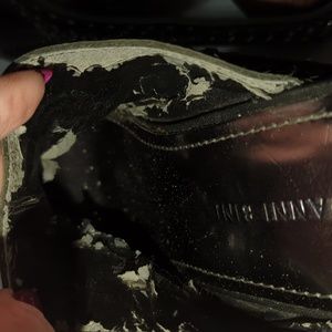 There's a mark on the inside of the left heel towards the bottom, which is mostly covered by the chain leather strap. (see close-up pic). The rubber outsole on the right shoe is missing and a replacement one can easily be glued on.