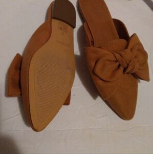 Elegant tan flats with a large bow. Ideal for everyday comfort and style.