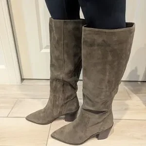 Moss green genuine suede boots. knee high, pointed toe. The western trend is reinterpreted for modern life with this comfy, knee-high boot crafted with a cowboy-style pointy toe and stacked heel. A hidden elastic inset makes it easier to pull on and off.