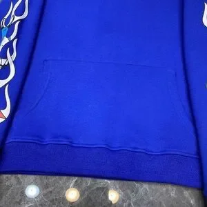 Vibrant blue hoodie with striking graphics. Features bold designs on sleeves and back. Ideal for casual style.
