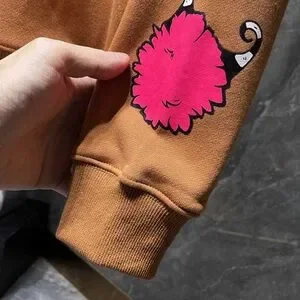 Tan hoodie featuring bold pink graphics and a unique design. Ideal for casual outings.