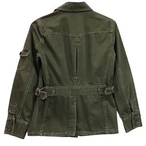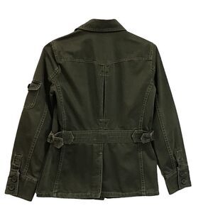 Great looking olive green cargo military style J. Crew jacket. Four front pockets and one sleeve pocket. Side buckles to cinch in waist, back has inverted pleat and slit at bottom. Some distressing throughout which gives it a worn in look. Good pre-owned condition.