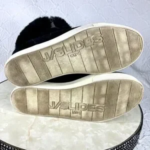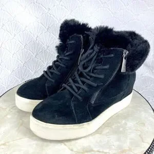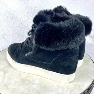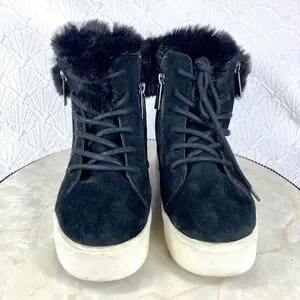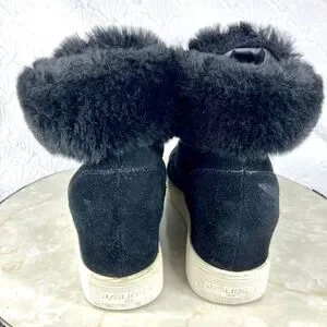 Chic black booties with plush fur accent. Features lace-up front and side zipper. Durable white sole for comfort.