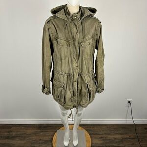 Stay stylish and comfortable with this olive hooded jacket. Perfect for any casual outing. In good used condition