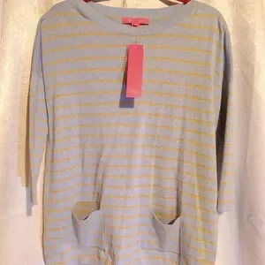 This is a beautiful heathered crew blue, coastal shell striped sweater made by Lilly Pulitzer. It is brand new with tags and no flaws. This sweater is simply adorable and features front pockets, side splits, soft knitting, and a boat neck design. A must have for spring. Order it today ❤️😊