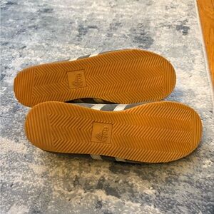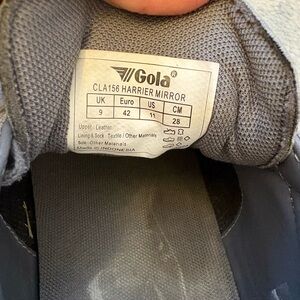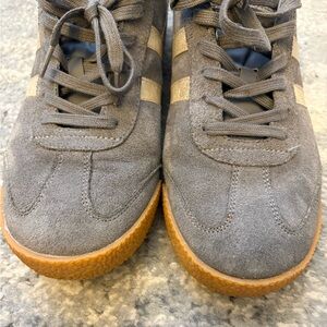 Gola Classics Women's Harrier Mirror Suede Sneakers, women’s SZ 11 and men’s 9. Dark grey/blue and gold but color is called Mocha/Gold/Gum. Worn only a few times. Super clean and in great condition. Inner sticker stating that the suede is not color fast is coming off the one shoe and came off the other one. Gola logo on foot bed rubbed off. Otherwise incredible condition. Super sturdy and cute shoes. Hard to find size. Offers welcomed.