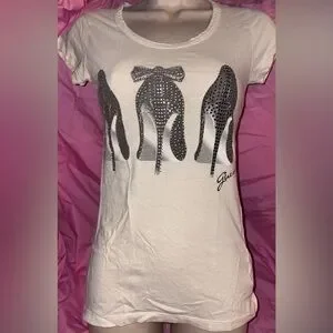 Guess white rhinestone studded high heel bling T-shirt size XS