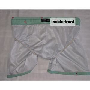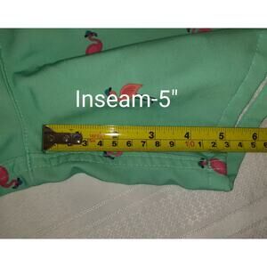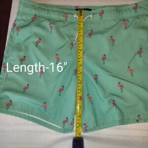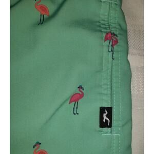 Previously Owned Hollister Mens Green Swim Trunks. Has a Flamingo print and a white mesh lining.