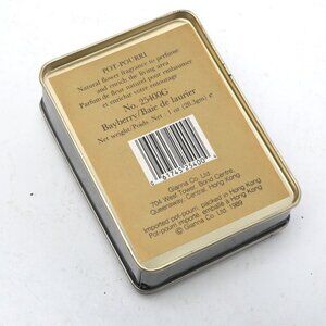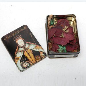 Good condition with light wear to tin. Still has original pout-pourri Bayberry flowers inside. See images
