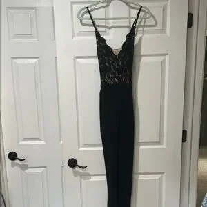 Elegant black jumpsuit with lace bodice. Spaghetti straps. Perfect for evening wear.