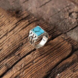 Product details Ring size 7 Material Gemstone Metal type Sterling Silver Gem type Simulated turquoise Item type name Statement Ring About this item Handcrafted: This ring is meticulously handmade with solid genuine 925 sterling silver, featuring a Cuban link chain motif braid. Turquoise Stone: Adorned with a striking simulated turquoise stone, adding a touch of natural beauty and elegance. Versatile Design: Suitable for both men and women, this ring can be worn as a statement piece or stacked with other rings. Stamped Authenticity: The 925 stamp guarantees the ring's authenticity and high-quality sterling silver composition. Weight is 0.29 OZ 0.5 gram,. Face Dimensions is 0.56*0.48 inch from See more About this item