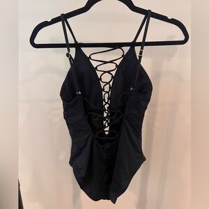 Elegant swimsuit with lace-up detail. Ideal for beach outings. Size: 10.