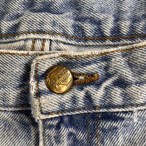 Classic Georgia Jean Co leather patch on waistband, brass Georgia Jean Co logo button