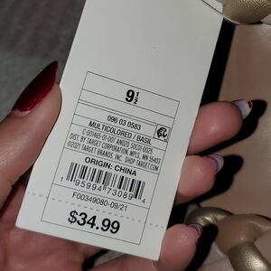 • "Simple and stylish, these Basil Heeled Sandals from A New Day™™ Make a versatile addition to your footwear collection. Made with two bands showcasing a woven design, these slip-on heel sandals with an open toe help create a chic look whether you're ready for the office or a dinner party. In multicolored with metallic color, these sandals have a unique, round 3.25-inch basil heel and easily pair with most of your dresses, office wear and other outfits." ~Target.com. Era September 2021.