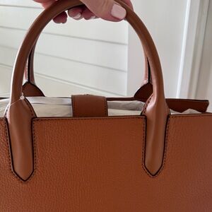 Chic tan leather satchel with elegant woven details. Perfect for everyday use.