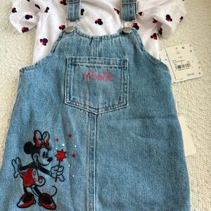 NWT Disney overalls with a cute Minnie Mouse design and matching white onsie.