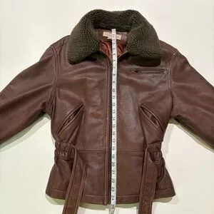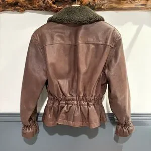 Discover timeless elegance with this vintage leather jacket. This brown jacket features a plush collar which is removable. sleek, belted design, perfect for any occasion. Cinched waist.