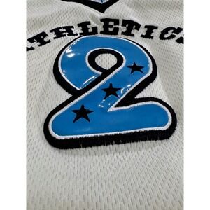 Mac Henry Athletics basketball jersey. This sleeveless top features a classic athletic design with a white body, blue and accents, and a large number '2' with star details on the front. The top has a V-neckline with striped ribbing and is made from breathable and lightweight material.