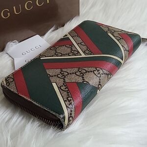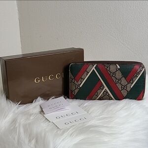💯Authentic Gucci Round Zip Long Wallet GG Chevron Beige Green Red🍀