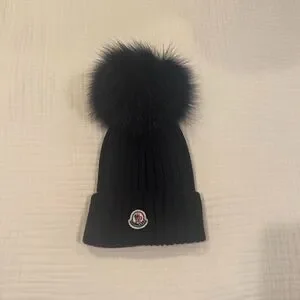 Elegant black beanie with a soft faux fur Pom Pom. Moncler, never worn. Currently on sale at Neiman Marcus