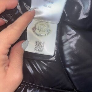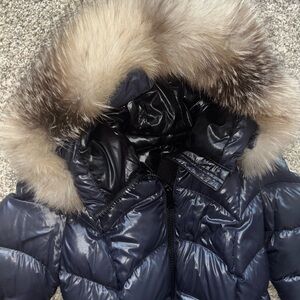 Elegant navy puffer coat by Moncler. Features a cozy fur-trimmed hood. Perfect for winter warmth.