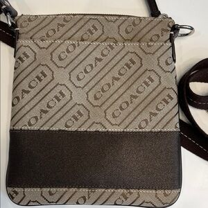 Elegant Coach crossbody bag with signature pattern. Features fabric adjustable strap and secure zip closure.