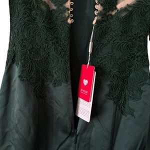 JJ’s House Emerald Green Beige Embroidered Satin Button Evening Gown Dress