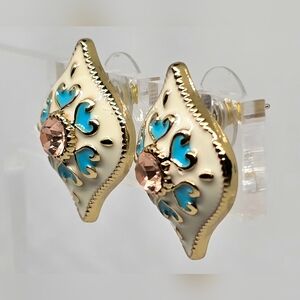 Vintage Style Enamel, Rhinestone Gold Tone Earrings