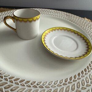 Add a pop of sunshine to your collection with this stunning Fitz and Floyd FF demitasse teacup and saucer set. Featuring bold yellow scalloped detailing and elegant gold trim, this piece exudes Art Deco charm. Perfectly sized for espresso or display, it’s a beautiful addition to any vintage tea set or collector’s shelf.