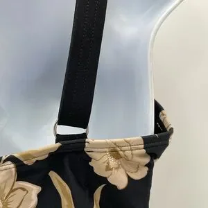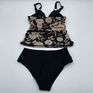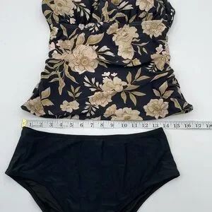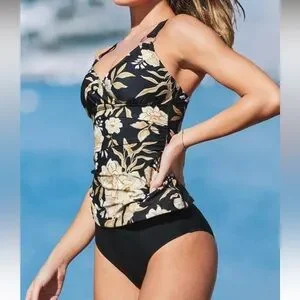 Elegant floral tankini swimwear in black, perfect for a stylish beach day.