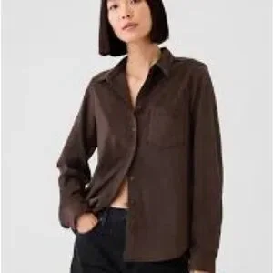 Gap Women's Vegan Suede Long Sleeve Classic Perfect Shirt In Brown - Size L New with tags Our Perfect Shirt has always been a classic. Now we’re giving it a name to match. Made in supersoft fabrics and designed with clean stitching. This has always been, and will always be, the best button-up out there. Soft vegan suede button-front shirt. Point collar, button front. Long sleeves. Front patch pocket. Curved hem. LB5