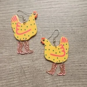 Fun yellow chicken earrings with pink glitter boots. Perfect for a quirky style.